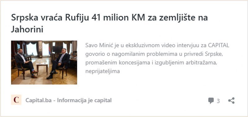 Podsjećamo, premijer RS Savo Minić prošle godine je u intervjuu za CAPITAL otkrio da će Vlada pod pritiskom Ustavnog suda BiH raskinuti ugovor o prodaji zemljišta na Jahorini za 41 miliona KM.