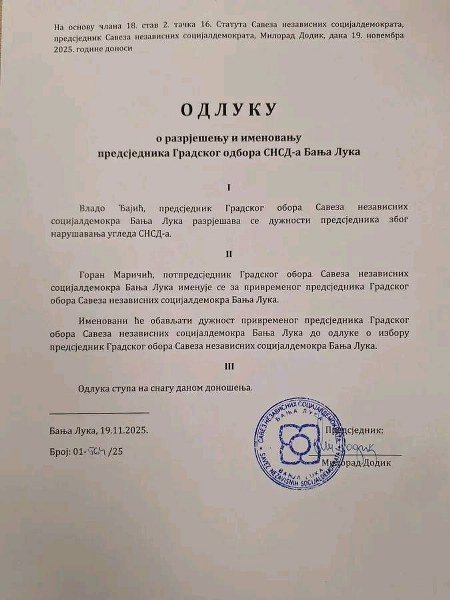 Dodik je već donio odluku da Gradskog odbora SNSD-a Banjaluka zbog narušavanja ugleda stranke, te za privremenog predsjednika ovog odbora imenovao Gorana Maričića.