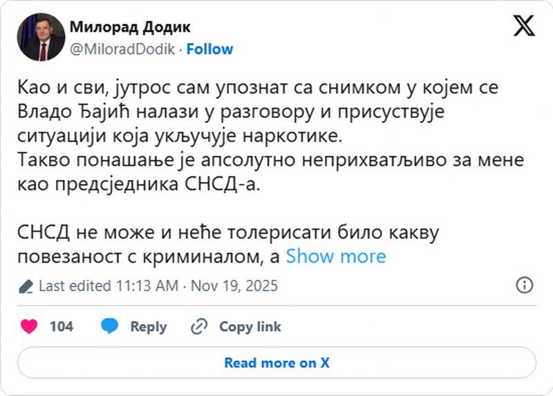 “Kao i svi, jutros sam upoznat sa snimkom u kojem se Vlado Đajić nalazi u razgovoru i prisustvuje situaciji koja uključuje narkotike. Takvo ponašanje je apsolutno neprihvatljivo za mene kao predsjednika SNSD-a”, poručio je Dodik i dodao: “Đajić je tim postupkom sam sebe razriješio sa svih funkcija. Naša politika svoje temelje ima u najboljim osobinama našeg naroda i mora to i da ostane – bez izuzetaka”, napisao je Dodik.