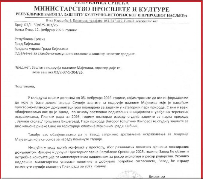 Kako navode u Gradu Bijeljina, obrazloženje Republičkog zavoda za zaštitu kulturno-istorijskog i prirodnog naslijeđa za izuzimenje Majevice iz Plana rada za 2026. godinu, jeste potencijalni konflikt zbog različitih planskih rješenja planiranih dokumentom o izmjenama i dopunama Prostornog plana RS-a, te da će Zavod obaviti konsultacije sa ministarstvima nadležnim za ekologiju i rudarstvo.