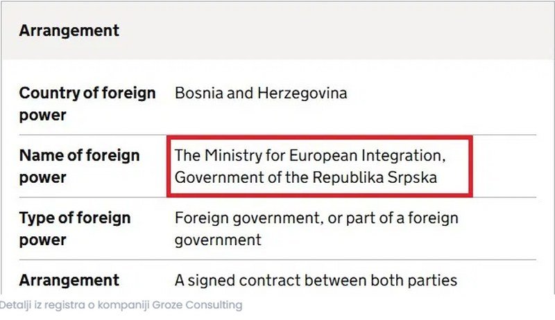 Prema informacijama koje smo pronašli u registru, RS je angažovala kompaniju CGC reSolutions LTD s ciljem da” otvori, razvije novi, diskretni kanal komunikacije između Vlade RS i vlasti Ujedinjenog Kraljevstva kako bi se omogućilo bolje razumijevanje politika RS i uključivanje RS u dijalog s ciljem osiguranja obostrano korisnih ciljeva u okviru Dejtonskog mirovnog sporazuma ili bilo kojeg naknadnog sporazuma za Bosnu i Hercegovinu”.