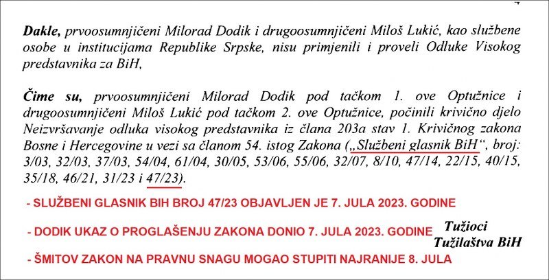 Suštinu pravne neodrživosti sporne optužnice vidite sa gornje fotografije njenih navoda i pravno relevantnih činjenice koje sam dodao crvenim tekstom. Vidite da se tužilaštvo poziva na Službeni glasnik BiH broj 47/23 u kom su objavljene i Šmitove odluke o stavljanju van snage zakona Narodne skupštine RS i njegove izmjene Krivičnog zakona BiH.