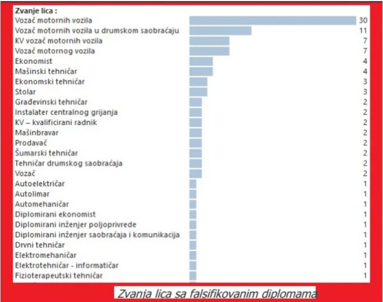 Na lažnim dokumentima najčešće piše – vozač, u više od 50 odsto slučajeva “vozač motornog vozila “ili “KV vozač”, zavisno od nivoa stručne spreme. Neuporedivo manje su lažirane diplome drugih zanimanja poput stolara, ekonomista ili kuhara. To je otkriveno tek u jednom ili dva slučaja.