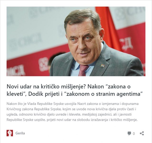 “Ovih dana ćemo predložiti novi zakon o djelovanju nevladinih organizacija i sličnih udruženja na prostoru RS. Biće doslovno prepisan zakon od SAD. One u svom zakonu te strane nevladine organizacije nazivaju stranim agentima na prostoru SAD. Mi ćemo preuzeti svu terminologiju, samo umjesto onoga SAD biće napisana Republika Srpska. Gdje piše Ministarstvo pravde SAD, pisaće Ministarstvo pravde RS, pa da vidimo šta će Amerikanci na to reći, a to podrazumijeva da prijavite svaku vrstu transakcije i sve što rade”, izjavio je Dodik juče, dok je već naredni dan krenula propaganda i spinovanje na RTRS-u.