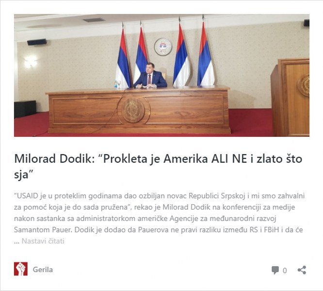 “Uostalom, od te američke agencije su plaćeni. Zbog toga vlasti Srpske moraju da obrate pažnju na finansiranja iz inostranstva. Prekid takvih grantova i dotacija veoma brzo i radikalno bi smanjio mogućnost destabilizacije BiH i Srpske. Međutim, da li su vlasti Srpske spremne da donesu zakon o stranim agentima? Izjava predsjednika Milorada Dodika da je potrebno donijeti takav zakon, upravo po ugledu na takav u SAD, nagovještava tu mogućnost. Građani Srpske bi većinski to podržali. Pritisci iz Vašingtona i Brisela bi mogli biti anulirani jasnim navođenjem da takve zakone imaju i zapadne države”, zaključuje Perišić.