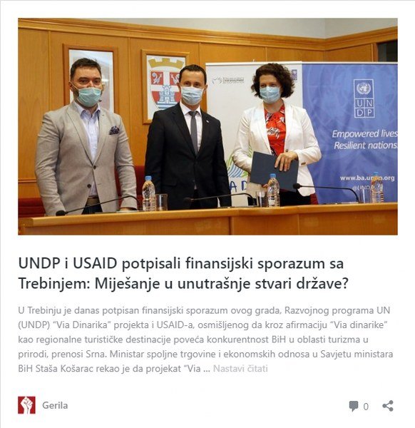 Kadrovi SNSD-a su tada “na sva zvona” hvalili USAID, koji je dvije godine prije toga bio etiketiran od strane njihovog šefa, Milorada Dodika, kao organizacija koja “radi pod plaštom borbe protiv korupcije, ali se radi o miješanju u unutrašnje stvari države”.