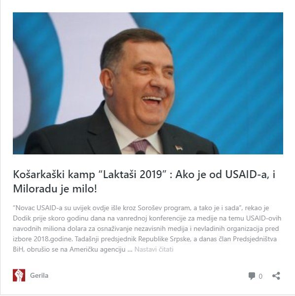 “Nevladine organizacije u BiH su finansirane od strane raznih fondova i vlada zapadnih zemalja (NATO-a i EU). Odmah se pitamo – da li su te domaće organizacije “nevladine” ako ih finansiraju zapadne vlade? Naravno da nisu. Јedna od američkih državnih agencija koje učestvuju u finansiranju NVO sektora u BiH je Američka agencija za međunarodni razvoj (USAID)”, navodi se u tekstu profesora geopolitike Srđana Perišića koji prenosi RTRS.