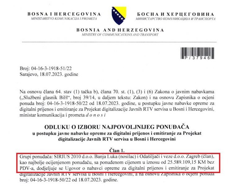 Odluku o izboru najpovoljnijeg ponuđača je navedenog dana potpisao državni ministar komunikacija i prometa BiH Edin Forto, a nakon što je Komisija za provođenje postupka javne nabavke opreme za digitalni prijenos i emitiranje provela ovu proceduru.