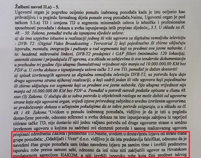 Kako se navodi u žalbi, utvrđeno je da je OIV sam sebi izdao izjavu o ispunjavanju uslova, konkretno o izgradnji DVB-T2 mreže, odnosno projektu digitalizacije na nivou Hrvatske.