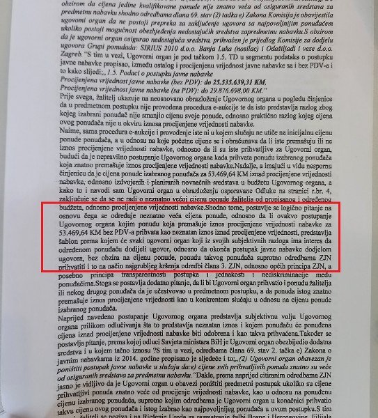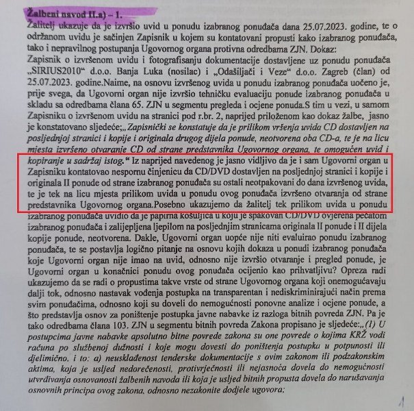 Foto: Faksimil dijela žalbe o nezakonitom prihvacanju vece cijene