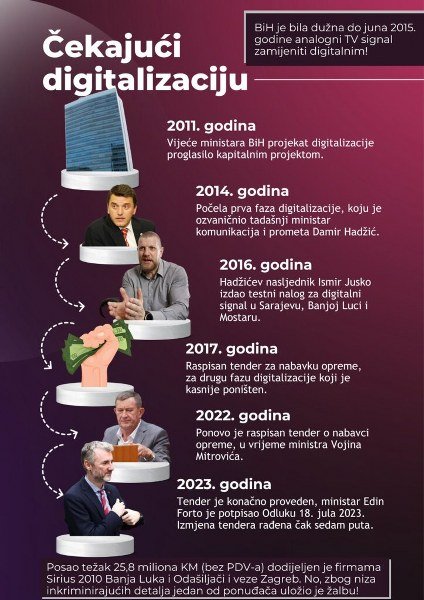 Inače, BiH je bila dužna do juna 2015. godine ugasiti analogni televizijski signal, odnosno zamijeniti ga digitalnim. Četiri godine ranije Vijeće ministara BiH je projekat digitalizacije proglasilo kapitalnim projektom za BiH. Ni 12 godina kasnije taj projekat nije realizovan.