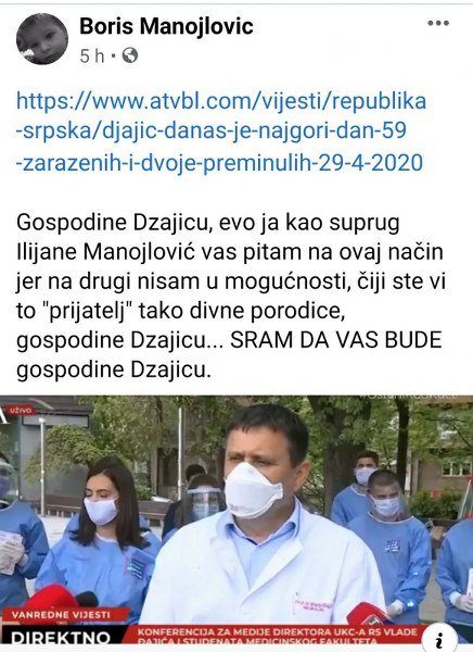 "Zamolio bih vas da jednu takvu tragediju ne zloupotrebljavate ovdje na cesti. Nama zdravstvenim radnicima je svaki život drag i borimo se za svaki život. Da dođe do smrti osobe od 90 ili 100 godina nama je žao, a naročito u takvim slučajevima. Službe rade na tome, ispituje se sve i molim vas ovdje na ulici da takve stvari ne komentarišemo, naročito što sam ja i prijatelj sa pojedinim članovima te divne porodice“- poručuje direktor Univerzitetskog kliničkog centra RS Vlado Đajić.