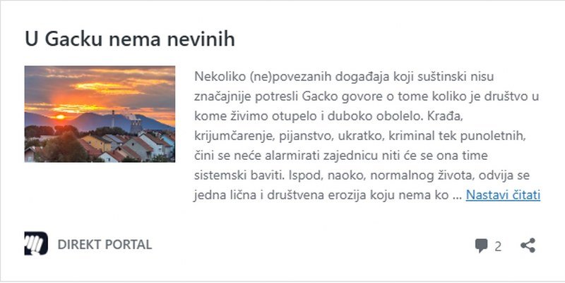 „Zašto ne pišeš o ovome što se dešava u Gacku?“, jedno je od pitanja koje mi upućuju ovih dana. „Šta se dešava“, kažem pomalo zauzimajući gard. „Pa, vidiš da ne može da se diše, o ovom jadu da pišeš, o zagađenju“, objašnjava. „Pisaću kad ljudi budu protestovali“, odgovaram pomalo revoltirano. „Pusti to, ovde nema ljudi“, uporan je. „Pa, kome onda da pišem?“, sada i ja sležem ramenima. „Piši da drugi vide šta nam se dešava“, i on spušta loptu. „Pisala sam više puta“, kažem i ja pomirljivo. „Piši opet, jedva se od magle vidi, sve su ispred farova pada prašina, sve se vidi“, konstatuje, sada već više za sebe.