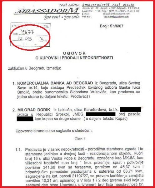 Prije nego što će krenuti iz Beograda Dodik je sa Komercijalnom bankom potpisao ugovor o navodnoj kupovini navedenog troetažnog stana i garaže u beogradskom naselju Dedinje.