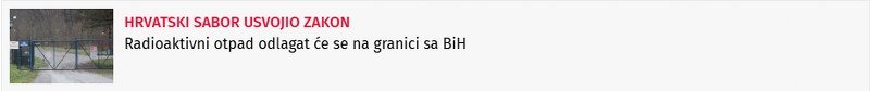 Hrvatski sabor 15. decembra izglasao je po hitnom postupku Zakon o izgradnji Centra za zbrinjavanje radioaktivnog otpada na Trgovskoj gori, uz samu granicu sa Bosnom i Hercegovinom. Ranije procjene kritičara te odluke navodile su da će ovim odlagalištem na manje od kilometar od granice sa BiH biti ugroženo zdravlje najmanje 250 hiljada ljudi u 13 opština u slivu rijeke Une, ali su iz Hrvatske negirali bilo kakvu opasnost za zdravlje stanovništva.