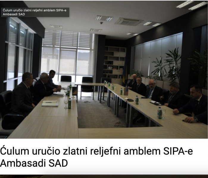 2. Isto tako očekivan je i postupak Darka Ćuluma, direktora SIPA, koji je "Zlatni reljef" SIPA uručio ambasadi SAD-a i direktoru Međunarodnog programa pomoći u obuci i krivičnim istragama Ministarstva pravde SAD Arturu Venegasu kao znak zahvalnosti.