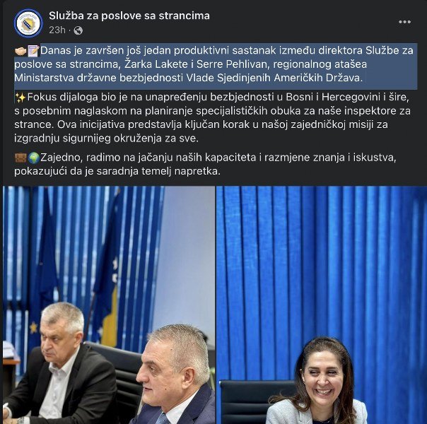 Na FB profilu te Službe navedeno je, između ostalog, “Završen je još jedan produktivni sastanak između direktora Službe za poslove sa strancima, Žarka Lakete i Serre Pehlivan, regionalnog atašea Ministarstva državne bezbjednosti Vlade Sjedinjenih Američkih Država”.
