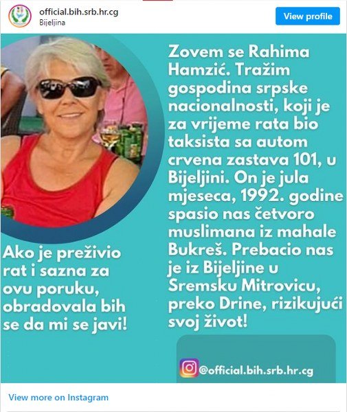 - Zovem se Rahima Hamzić. Tražim gospodina srpske nacionalnosti, koji je za vrijeme rata bio taksist s autom crvena zastava 101, u Bjeljini - započela je ona svoju objavu podijeljenu na Instagam stranici "Prijateljstvo BiH.SRB.HR.CG".