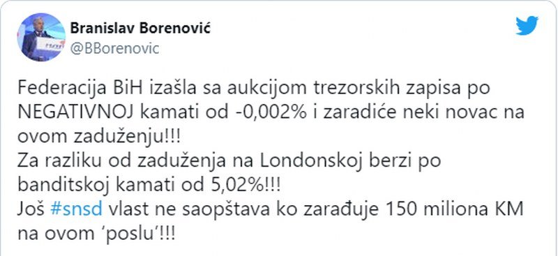 "Federacija BiH izašla sa aukcijom trezorskih zapisa po NEGATIVNOJ kamati od -0,002% i zaradiće neki novac na ovom zaduženju!!! Za razliku od zaduženja na Londonskoj berzi po banditskoj kamati od 5,02%!!! Još #snsd vlast ne saopštava ko zarađuje 150 miliona KM na ovom ‘poslu’!!!", napisao je Borenović na Twitteru.