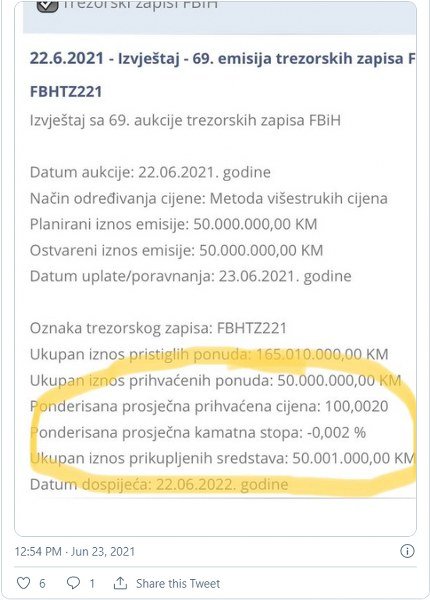 Jučer je Vlada Federacije BiH prodala trezorske zapise u vrijednosti od 50 miliona KM po negativnoj kamatnoj stopi od - 0,002. U konačnici to znači da je Federacija BiH dobila 1.000 KM više nego što će vratiti.