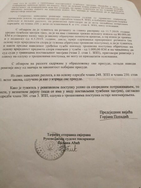 U međuvremenu, Šebić podnosi zahtjev Vrhovnom sudu za reviziju obje presude, a odlučujući po njegovom zahtjevu, Sud tada uvažava reviziju i donosi presudu kojom se iznos od 40 000 KM uvećava za duplo, a tom presudom se uvažavaju i zatezne kamate.