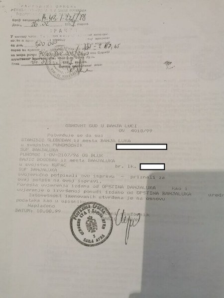 Ovjera istog ugovora u Osnovnom sudu Banja Luka 24.02.1999.godine