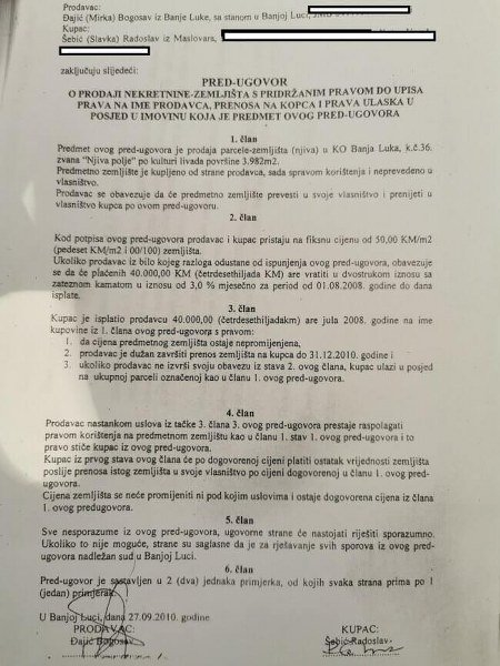 Nakon što se uknjižio u zemljišne knjige kao vlasnik zemljišta u društvenoj svojini, Đajić Bogosav na osnovu, kako objašnjava naš izvor, falsifikovane dokumentacije 27.9.2010. godine isto zemljište prodaje Šebić Radoslavu za 40 000 KM, ali izbjegava da izvrši prenos vlasništva, kako se pretpostavlja, zbog toga što je znao da je dokumentacija o prodaji falsifikovana.