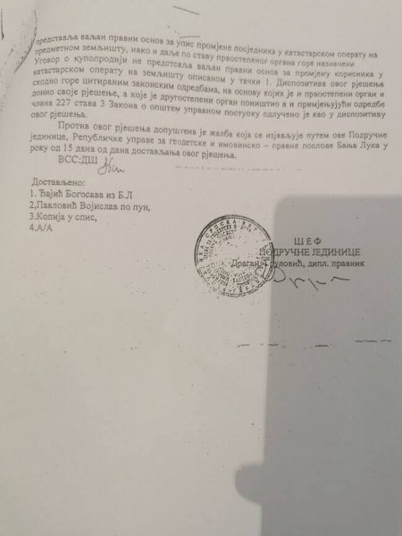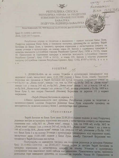 Na osnovu tog ugovora Bogosav se obraća RUGIP-u, tačnije Draganu Gruloviću, koji donosi rješenje na osnovu ugovora o prodaji. Prilikom donošenja rješenja Grulović konstatuje da je navedenu nepokretnost Vojislav Pavlović prodao Đajiću 15.5.1985. Međutim, prilikom izdavanja posjedovnog lista i zemljišnoknjižnog izvadka 26.9.2017. područna jedinica Banjaluka konstatuje da je navedeno zemljište opštenarodna imovina. – posjedovni list 1405 i zk