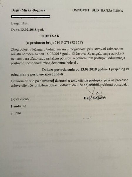 Kada je otvoren parnični postupak u OS u Banjaluci, na pripremnom ročištu pojavio se Đajić u pratnji advokatice Savić Rajne. Tada je prihvatio učestvovanje u postupku. Na zakazanom glavnom pretresu 13.2.2018. Đajić Bogosav upućuje podnesak OS u Banjaluci sa prijedlogom da ne učestvuje u daljem postupku zbog psihičkih smetnji i da mu sud oduzme poslovnu sposobnost zbog bolesti demencije. Za to prilaže potvrdu od zdravstvene ustanove Neurološke klinike Banjaluka gdje mu je konstatovano da je liječenje započeo u Banjaluci, a nastavio u institutu za kardiovaskularne bolesti na Dedinju u Beogradu. Nakon toga, sud određuje da Đajić više ne učestvuje u postupku.