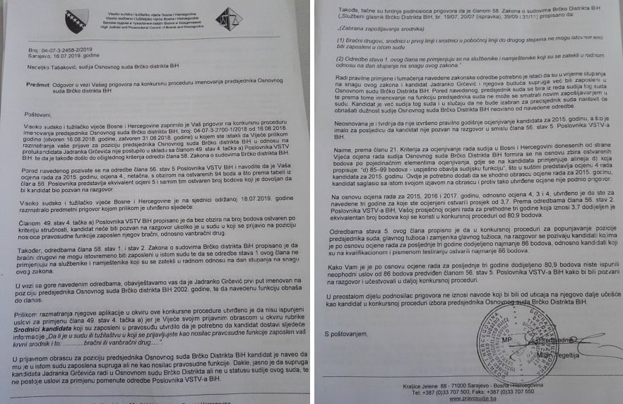 Tako je nastavljena afera koja prati imenovanje prvog čovjeka brčanskog suda, a o kojoj je eTrafika već pisala u više navrata. Podsjećamo, VSTS je imenovao Jadranka Grčevića za predsjednika Osnovnog suda u Brčkom iako on nije ispunjavao uslove za imenovanje na pomenutu poziciju jer mu je u istoj instituciji zaposlena i supruga, a što je u suprotnosti sa Pravilnikom o radu VSTS (Sadržaj Pravilnika možete pogledati u sljedećem dokumentu: Poslovnik o radu VSTV. Opširnije čitajte u tekstu: VSTS, uz neuvjerljivo obrazloženje, imenovao sudiju koji ne ispunjava uslove.