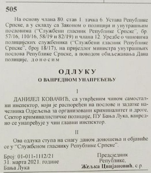Onda je Dodik, da bi ponizio Lukača, natjerao da povuče unapređenje, što je ona učinila nakon samo četrdesetak dana od imenovanja (10.05.2021.), čime je ponizila samu sebe (što joj je konstanta) i naravno, Lukača, na čiji prijedlog je Kovačić i dobio čin Glavnog inspektora.