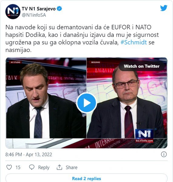 Na navode koji su demantovani da će EUFOR i NATO hapsiti Dodika, kao i današnju izjavu da mu je sigurnost ugrožena pa su ga oklopna vozila čuvala, Schmidt se nasmijao.
