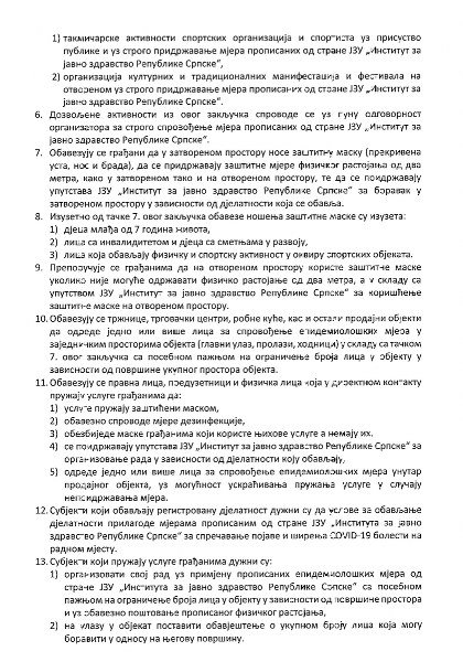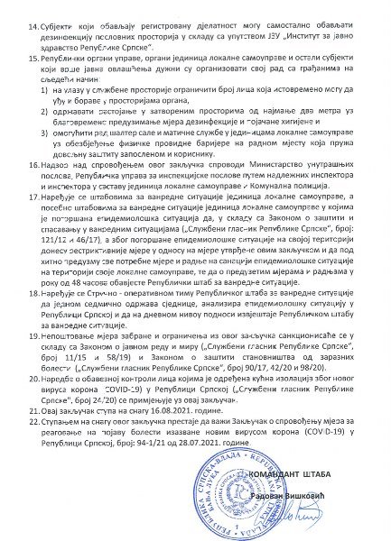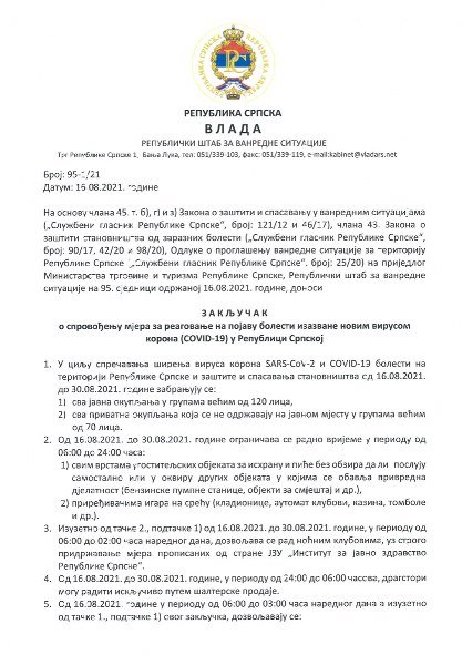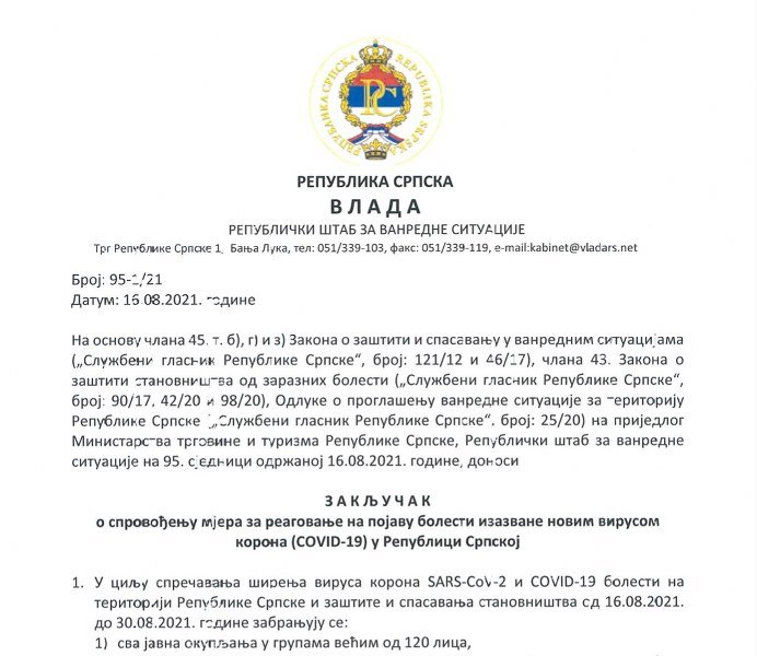 U Zaključku se, u tački 1., navodi: U cilju sprečavanja širenja virusa SARS - COV - 2 i COVID 19 bolesti na teritoriji Republike Srpske i zaštite i spasavanja stanovništva od 16.08.2021. godine do 31.08.2021. godine ZABRANJUJU SE: