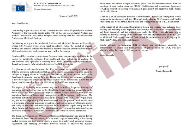 Prethodno je, kako je CAPITAL objavio, direktor Direkcije za susjedstvo i pregovore o proširenju u Evropskoj komisiji Maciej Popowski u dopisu najvišim zvaničnicima Srpske zatražio da se obustave sve aktivnosti na uspostavljanju Agencije za lijekove i medicinska sredstva na nivou Republike Srpske, ističući da će to dovesti do poremećaja na tržištu i uticaće na pacijente i zdravstvenu zaštitu.