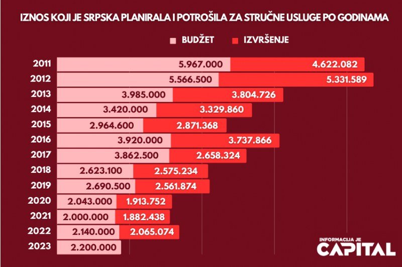 Najveći iznos Vlada je stranim konsultantskim kućama dala 2011. i 2012. godine i to 4,6 miliona KM i 5,3 miliona KM. U godinama nakon tog taj iznose se kretao od 1,9 do 3,8 miliona KM.