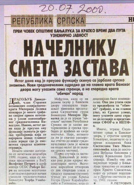 Umjesto odgovora Mazalici i ostalim lažnim srbendama i patriotama iz SNSD-a, koji sistematski uništiše i razoriše Republiku Srpsku i sve srpsko sa ove strane Drine, podsjećam ih na tekst Večernjih novosti od 20. 7. 2020. godine „Načelniku smeta zastava“ u kome dopisnik Petrović piše o tome kako je gradonačelnik Banjaluke Dragoljub Davidović, kadar Dodikovog SNSD-a, prvog dana mandata skinuo srpsku trobojku sa Banskog dvora, kopirajući Volfganga Petriča koji je prethodno naredio da se skine srpska zastava sa Skupštine grada Banjaluka nakon smjene gradonačelnika Đorđa Umićevića!?