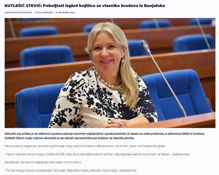 7. Dr Snežana Kutlešić Stević je prije nekoliko mjeseci, na sjednici Skupšine Grada Banjaluka, iznijela prijedlog za rubriku „vjerovali ili ne“. Ona je predložila da se naprave reprezentativnije knjižice za vlasnike plovila iz Banjaluke, uz obrazloženje da su trenutne knjižice skromne i da bi trebale biti ljepše.