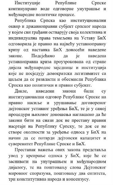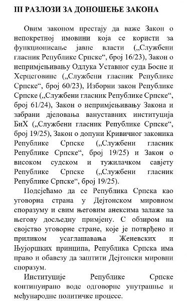 Naime, kao što se može vidjeti iz teksta tog obrazloženja u prilogu, Narodna skupština u njemu nije smjela ni da pisne o tome da Kristijan Šmit nije visoki predstavnik, kao što nije, i da, sve i da jeste visoki predstavnik, nema pravo, kao što zaista nema, da nameće zakone u BiH.