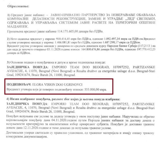 Pored toga, „Aviator Group“ je dostavila potvrdu da je učestvovala u realizaciji posla u Čačku vrijednog oko 2,5 miliona evra koji je obavila „Elgra Vision“, iako se u tenderskoj dokumentaciji za taj posao precizno kaže da nema angažovanja podizvođača.