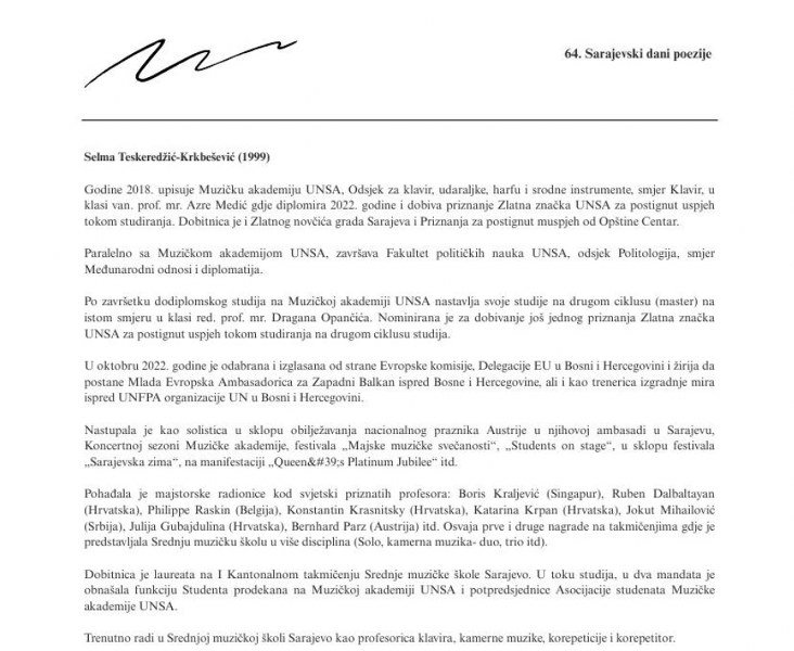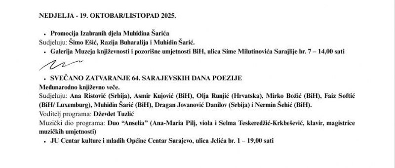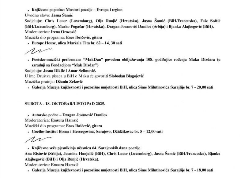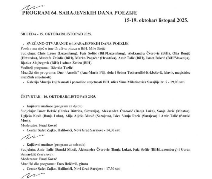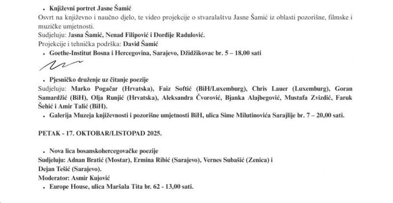 Ovogodišnje izdanje festivala bit će obilježeno učešćem više od 40 autora iz Bosne i Hercegovine, regiona i Evropske unije,čime se potvrđuje međunarodni značaj i kontinuirana otvorenost festivala prema suvremenim književnim tokovima i interkulturnom dijalogu.