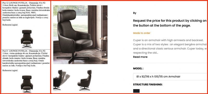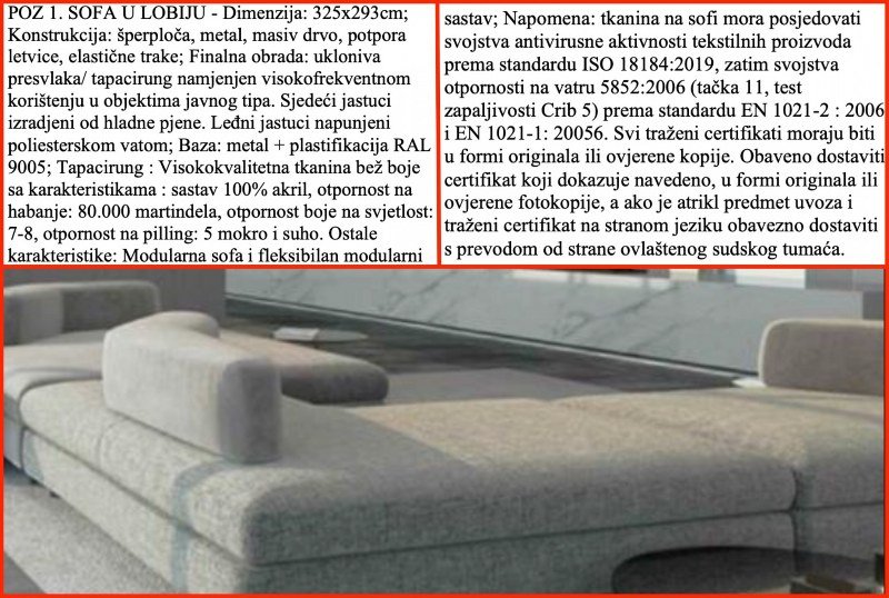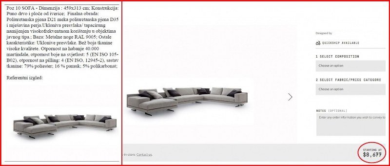 Foto: Lijevo - izvod iz tenderske dokumentacije, desno - identičan model na internet stranici koja prodaje skupocjeni namještaj