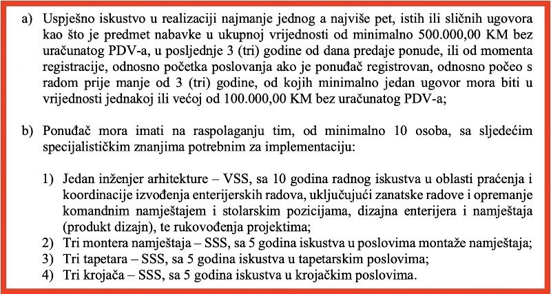 Tako se od ponuđača tražio jedan inžinjer arhitekture (VSS) sa čak 10 godina radnog iskustva u oblasti praćenja i koordinacije izvođenja enterijerskih radova. Pored toga, tražila su se i tri montera namještaja, tri tapetara, kao i tri krojača, te su svi morali imati po barem pet godina iskustva u tim oblastima.