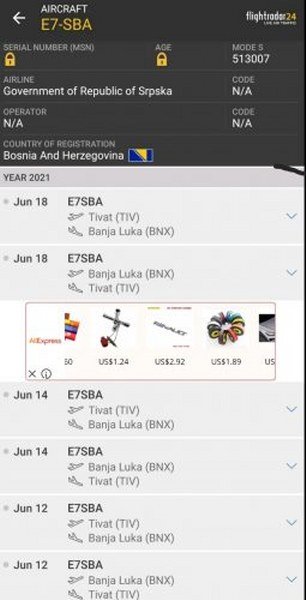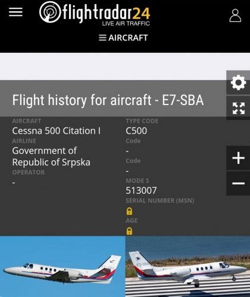 Avion „Cesna C500“ registarskih oznaka E7SBA registrovan je na Vladu Republike Srpske, govore podaci sa sajta „Flajtradar24“, koji evidentira i prati podatke i letove svih aviona.