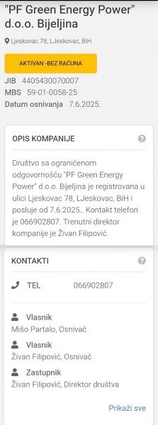 Podsjećamo, firma „PF green energy power“ u javnost je dospjela polovinom ove sedmice kada su mediji objavili službenu zabilješku MUP-a RS u kojoj se navodi da je policija tokom pretresa u mjestu Gornji Brodac na parceli u vlasništvu firme ‘PF green energy power’ pronašla dvije vreće sa 138,7 kilograma zelene biljne materije koja svojim izgledom asocira na marihuanu, otkrivajući pri tom da je pomenuta firma u suvlasništvu dugogodišnjeg šefa Dodikovog obezbjeđenja Miše Partala.