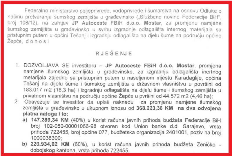 Rješenjem Ministarstva je ovoj kompaniji dozvoljena sječa 18,3 hektara šume u državnom vlasništvu na području općine Tešanj i 4,46 hektara šume u privatnom vlasništvu na području Općine Žepče. Rješenja se u oba slučaja odnose na izgradnju odlagališta inertnog materijala.