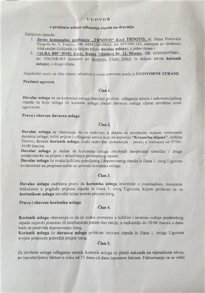 Foto: Faksimil Ugovora potpisanog sa komunalnim preduzećem iz Breze