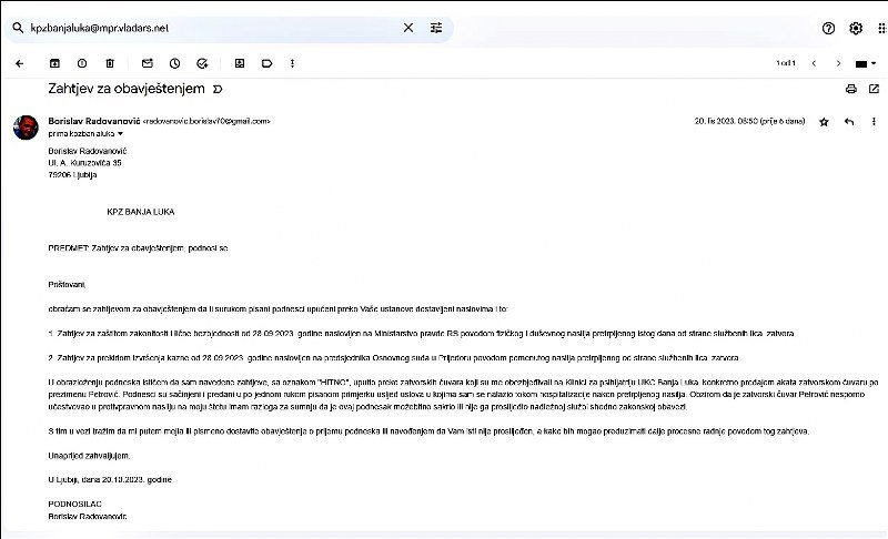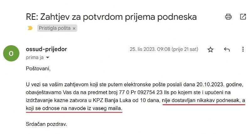 Na gornjoj slici vidite elektronski upit KPZ Banja Luka od 20.10.2023. godine povodom podnesaka Ministarstvu pravde i Osnovnom sudu u Prijedoru koje sam uputio neposredno nakon prebijanja, odnosno tokom hospitalizacije na UKC-u. Ministru pravde sam se rukom pisanim podneskom obratio sa Zahtjevom za zaštitom zakonitosti i lične bezbjednosti, dok sam od predsjednice suda Danijele Elenkov tražio prekid izvršenja kazne. Oba naslova sa oznakom "HITNO" obavijestio sam o pretrpljenom nasilju i krivičnim djelima, a sad provjeravam dalje postupanje sa podnescima.