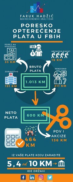 Slikovit prikaz dao je ekonomista Faruk Hadžić. Po njegovom izračunu, ako ste dobili neto platu od 600 KM, državi za doprinose i poreze ide 413 KM, od čega 211 KM u penziono.