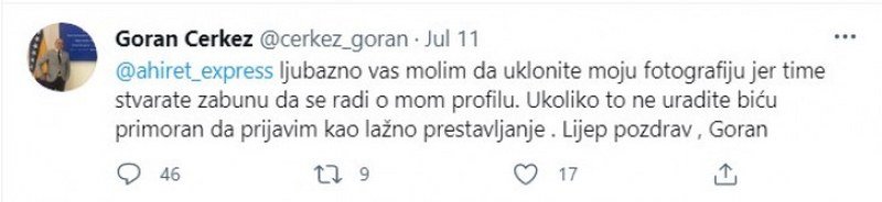 - Ahiret express, ljubazno vas molim da uklonite moju fotografiju jer time stvarate zabunu da se radi o mom profilu. Ukoliko to ne uradite biću primoran da prijavim kao lažno prestavljanje. Lijep pozdrav, Goran – napisao je Čerkez u svojoj objavi.