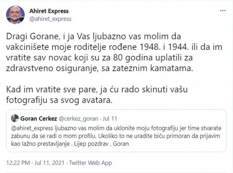 - Dragi Gorane, i ja Vas ljubazno vas molim da vakcinišete moje roditelje rođene 1948. i 1944. ili da im vratite sav novac koji su za 80 godina uplatili za zdravstveno osiguranje, sa zateznim kamatama. Kad im vratite sve pare, ja ću rado skinuti vašu fotografiju sa svog avatara – napisao je.